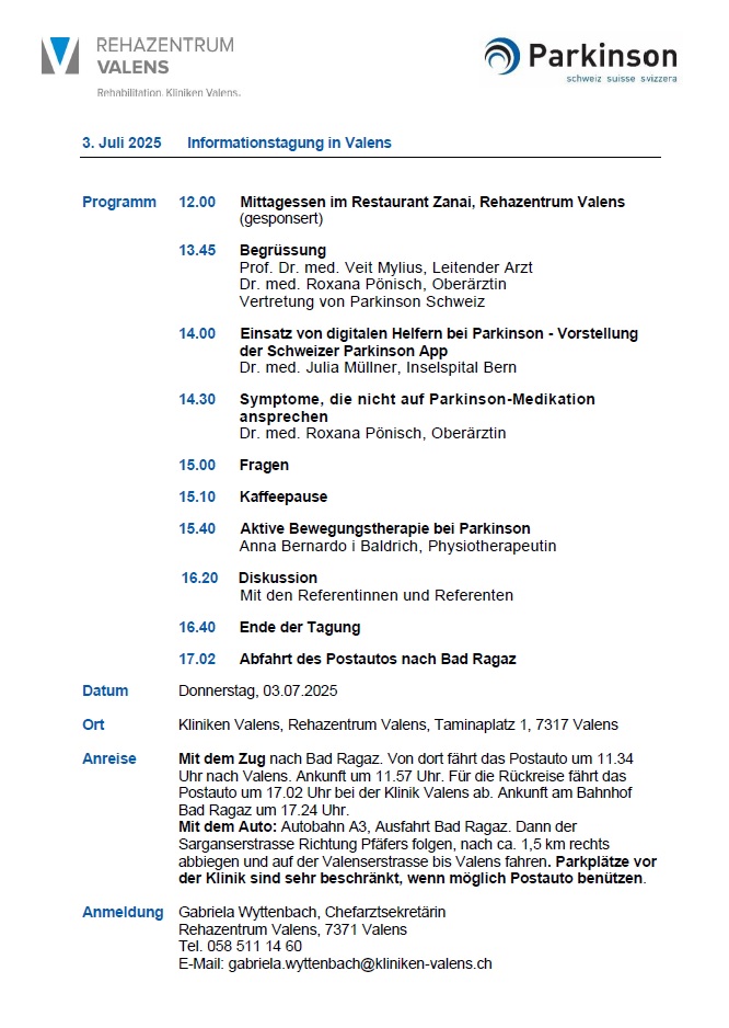 Parkinson Schweiz und das Rehazentrum Valens laden Sie am Donnerstag, 3. Juli 2025 herzlich zum jährlichen Parkinson-Informationstag ein.